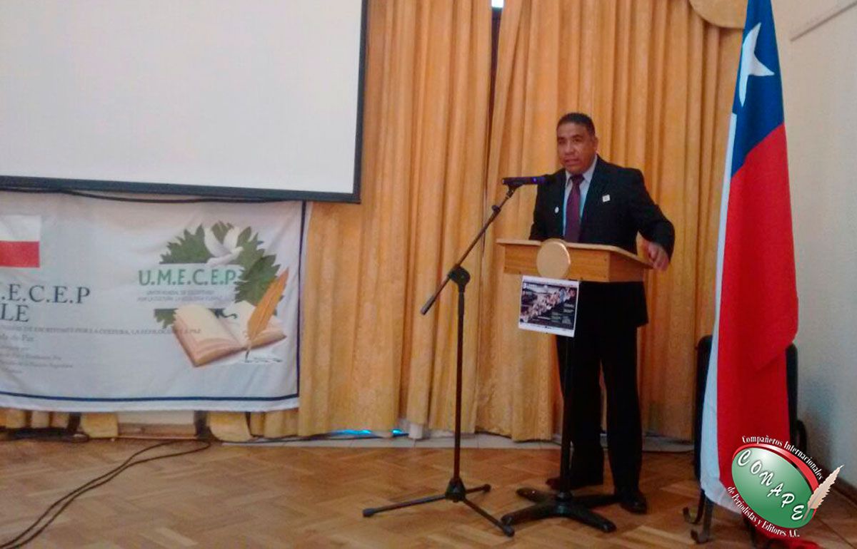 Valparaíso, Viña del Mar/Chile.- En el marco del Congreso por la Unión Mundial de Escritores, por la Cultura, la Ecología y la Paz que realizó UMECEP en Viña del Mar, Valparaíso en el país andino de Chile, Compañeros Internacionales de Periodistas y Editores A.C. (CONAPE), se hizo presente en la persona del Vicepresidente Internacional de CONAPE, el Lic. Alfredo Hernández Alvarado, quien en representación del Presidente Internacional de CONAPE, el Lic. Raúl González Nova, además de dar un saludo y los pormenores de lo que realiza CONAPE en diferentes países, dio una conferencia sobre los riesgos del periodismo regional en México.