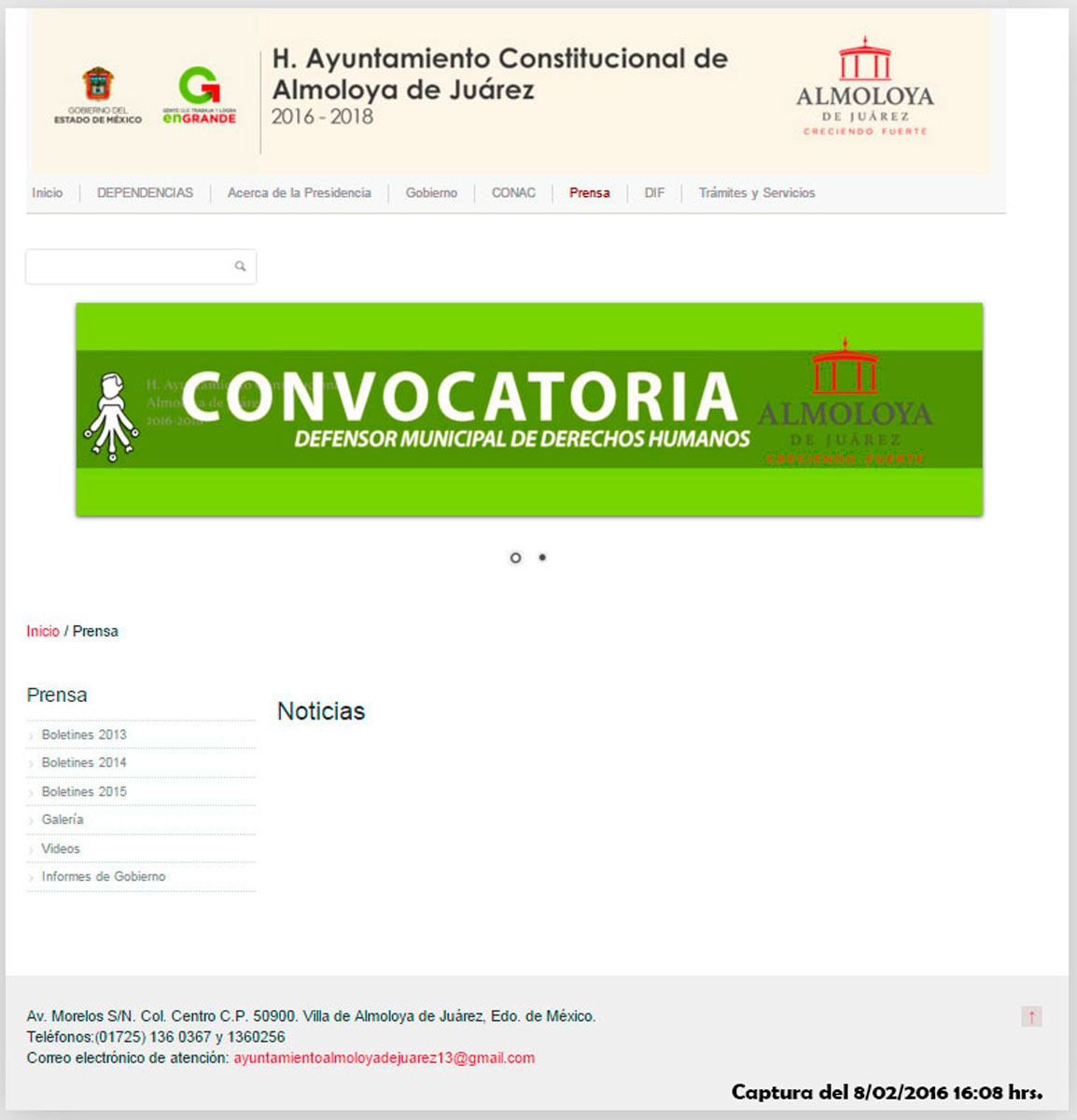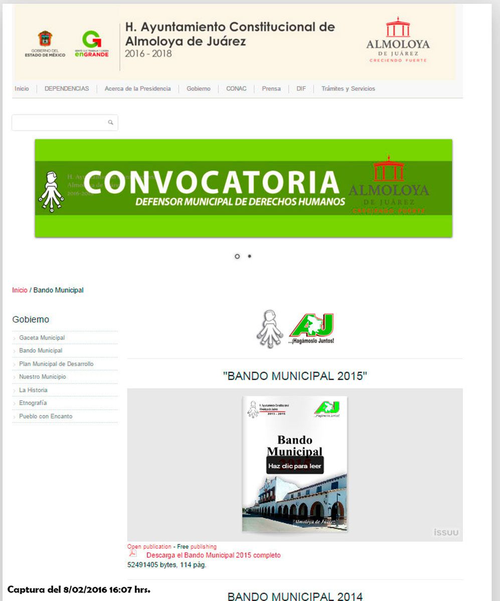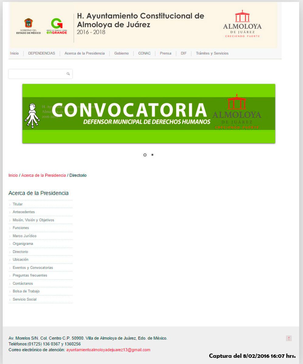 No conformes con lo anterior, parece ser que la administración no ha realizado ninguna acción a poco más de 5 semanas de administración, ya que en la parte de noticias de su página web (www.almoloyadejuarez.gob.mx) se muestra totalmente en blanco, de igual forma el nuevo bando municipal no ha sido publicado en dicha web, además de que no se ha respetado la ley de transparencia porque no existe ningún directorio en el que se pueda observar los nombres de los integrantes del cabildo municipal, los cuales se debieran conocer desde el primer día de la administración.