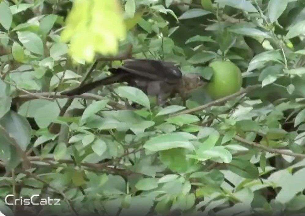 Mérida, Yucatán, 3 de octubre.— Un pájaro k’a’aw (zanate mayor) fue captado en vídeo bebiendo jugo de naranja directamente de una fruta que aún se encontraba en la rama. El ave metía la cabeza en la naranja, picoteaba el interior y echaba la cabeza hacia atrás, para beber el líquido.