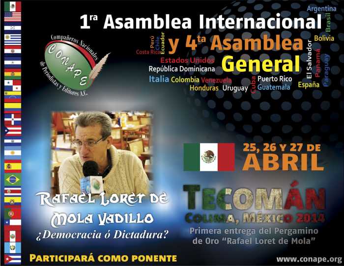 CONAPE CON RAFAEL LORET DE MOLA 10-01-2014 (20)Compañeros Nacionales de Periodistas y Editores A.C (CONAPE) es un organización que pugna por la libertad de expresión, de igual forma trabaja en favor de la capacitación y profesionalización de sus afiliados, no olvidando la gestión para mejorar las condiciones de trabajo de los periodistas en todo el mundo, actualmente agrupa a más de 500 periodistas diseminados en todo el territorio nacional, y 260 a nivel internacional, esto en diversos países como Ecuador, Italia, Republica Dominicana, Nicaragua, Cuba, Italia, España, Alemania, Colombia, Argentina, Estado Unidos, Venezuela, Costa Rica, Chile, Guatemala, Perú y Venezuela.