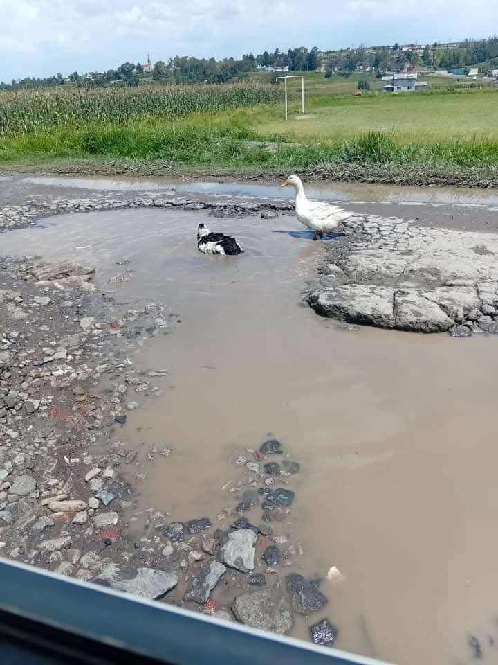 Almoloya de Juárez, Méx.- Las carreteras y caminos del municipio continúan en pésimas condiciones. La falta de mantenimiento es tan evidente, en la entrada del #BarrioElOcote Ejido de #SanMiguelAlmoloyan dos patos aprovecharon los grandes baches y encharcamientos para nadar tranquilamente.