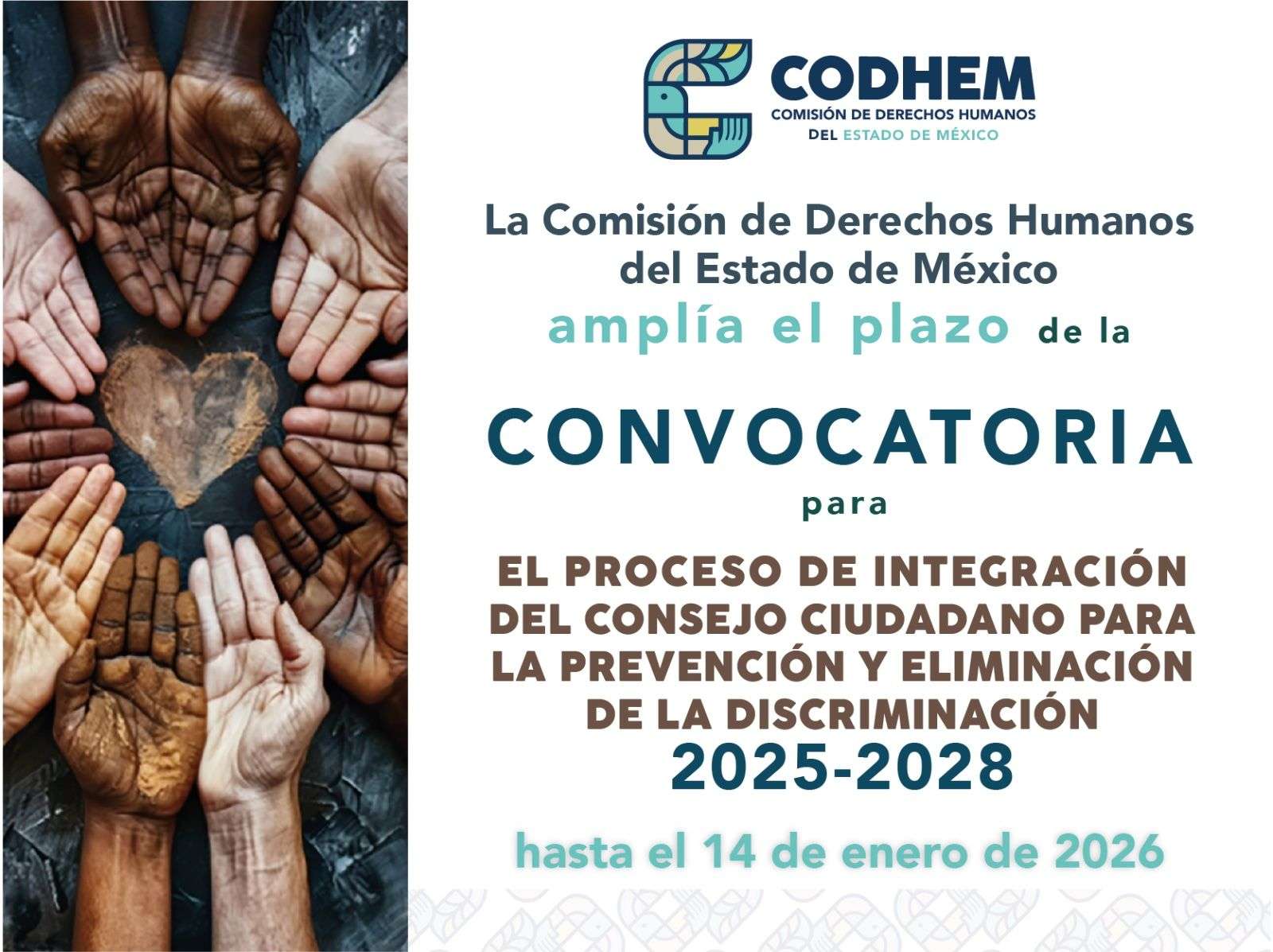 Toluca, Estado de México, 12 de enero de 2026.- La Comisión de Derechos Humanos del Estado de México (CODHEM) hace un llamado a inscribirse, a más tardar el 14 de enero, al proceso de integración del Consejo Ciudadano para la Prevención y Eliminación de la Discriminación 2025-2028.