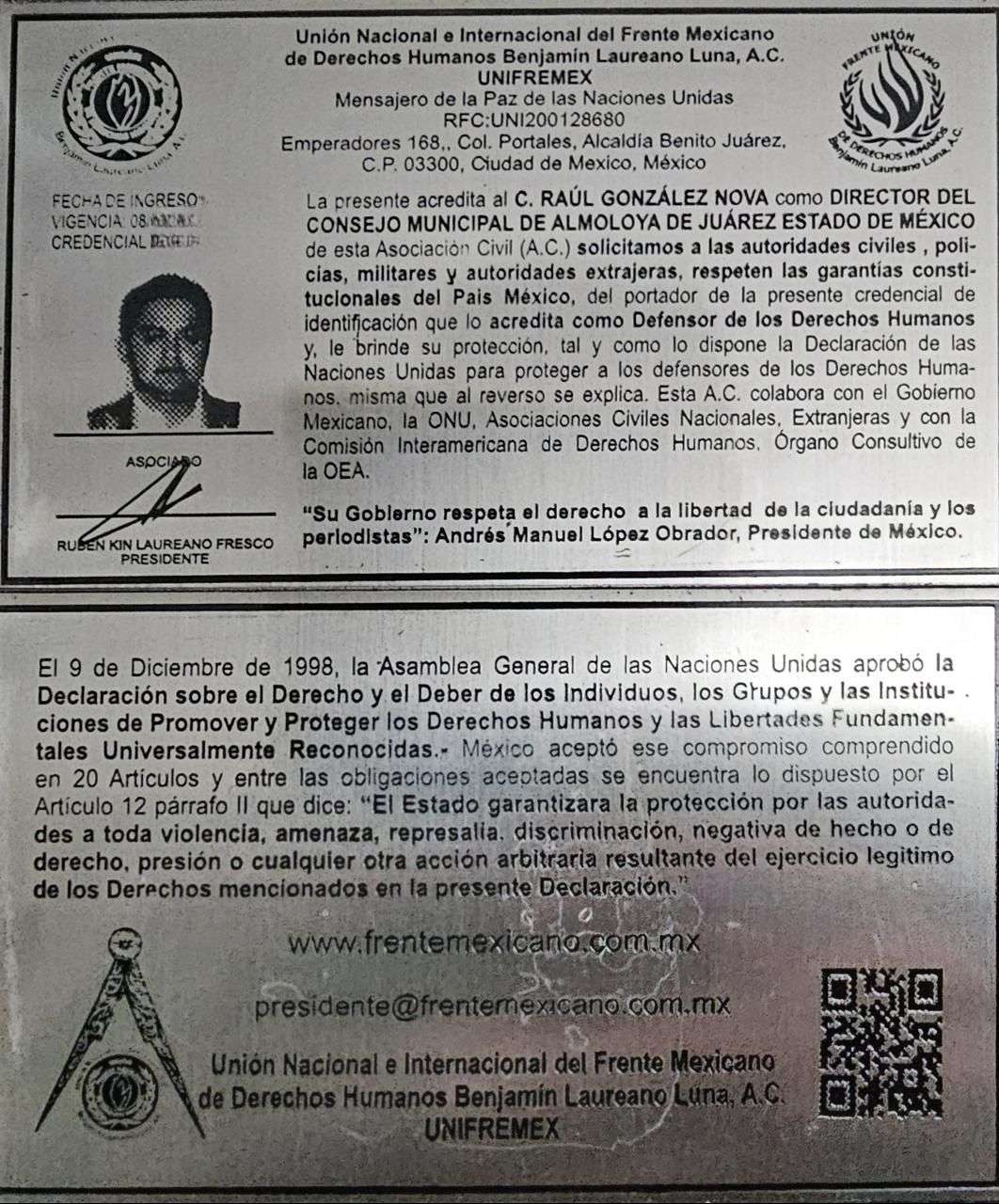 Ciudad de México.- La Unión Nacional e Internacional del Frente Mexicano de Derechos Humanos “Benjamín Laureano Luna”, A.C. (UNIFREMEX), reconocida como Mensajera de la Paz de las Naciones Unidas, acreditó oficialmente al C. Raúl González Nova como Director del Consejo Municipal de Almoloya de Juárez, Estado de México.